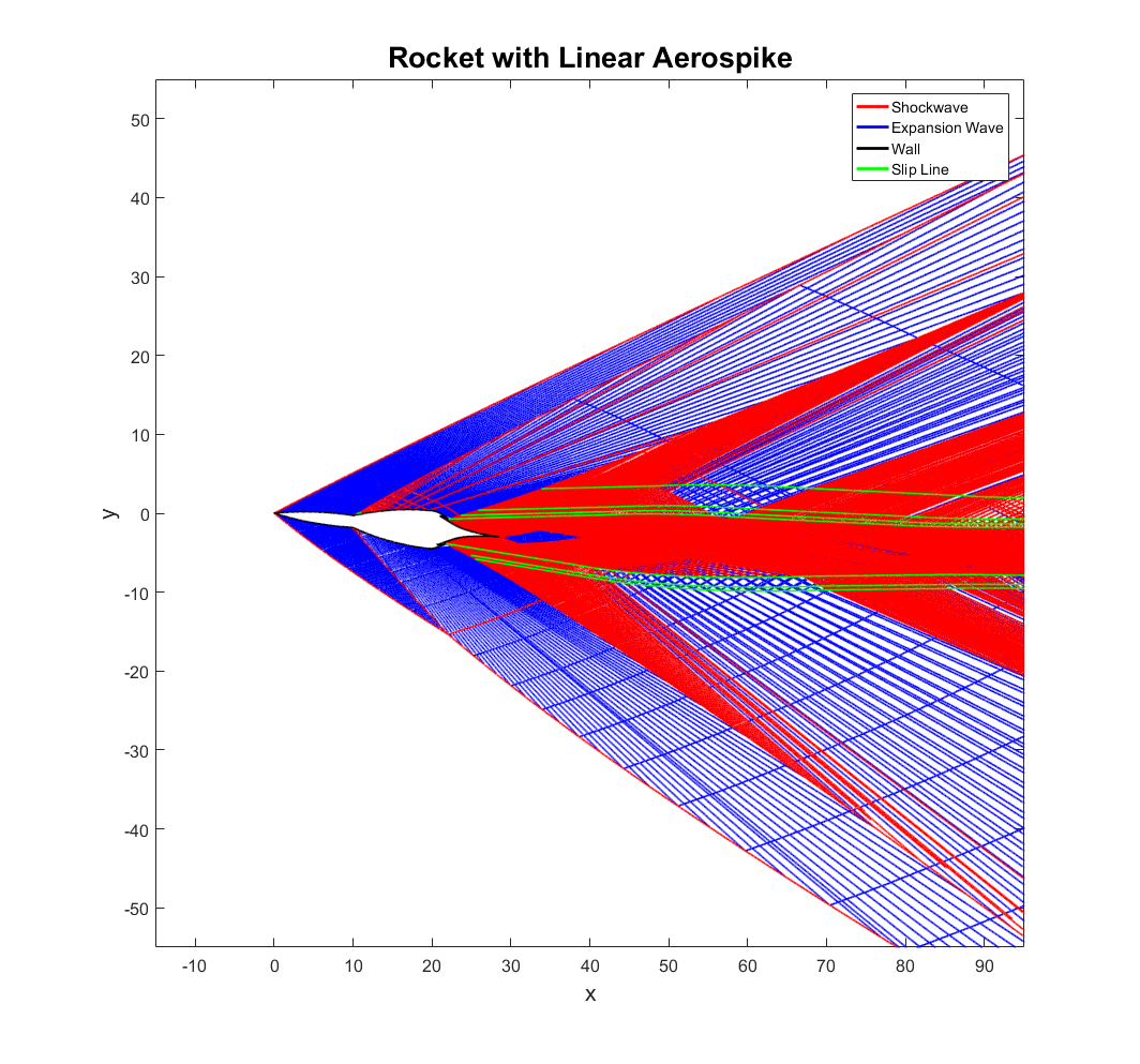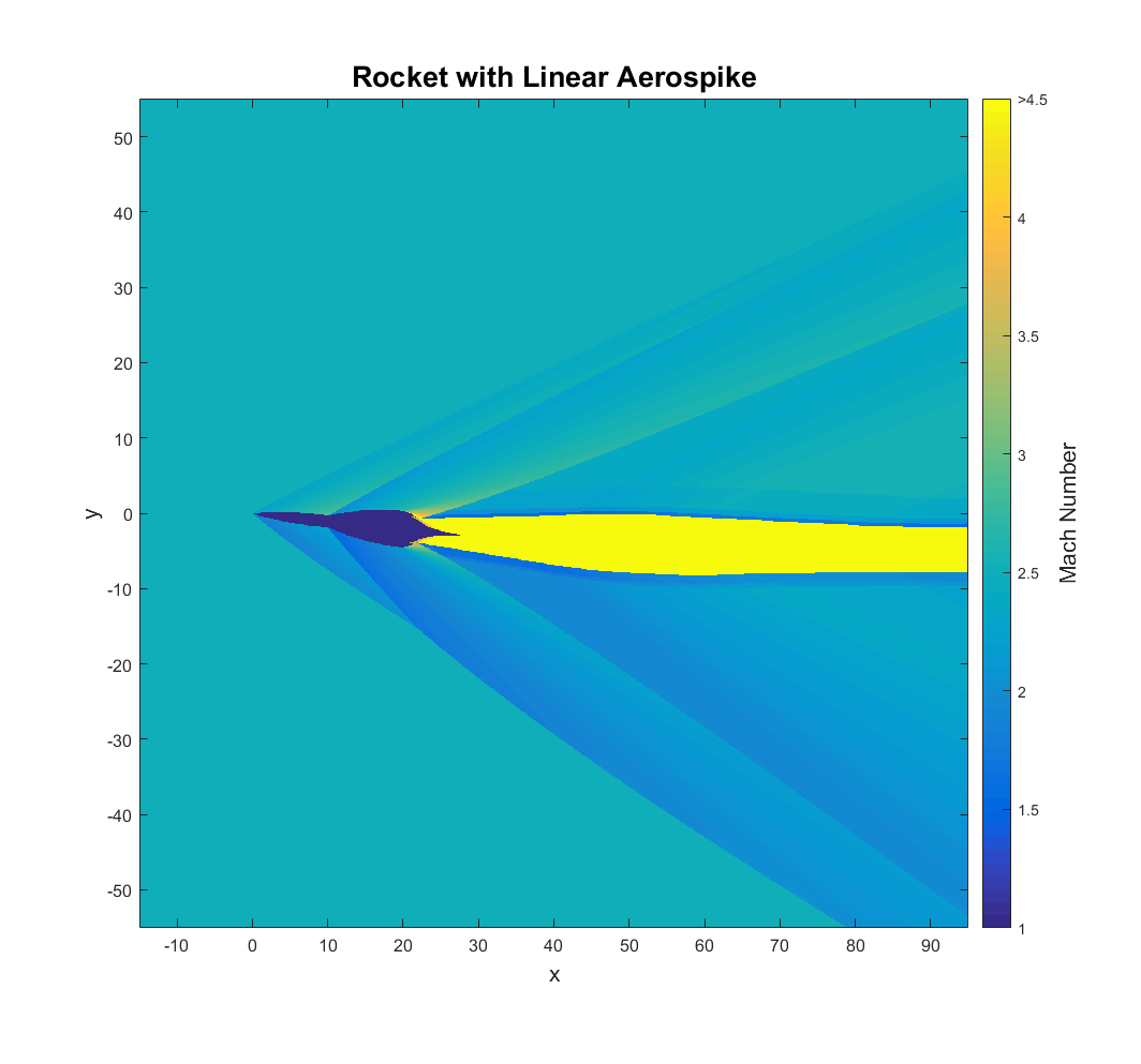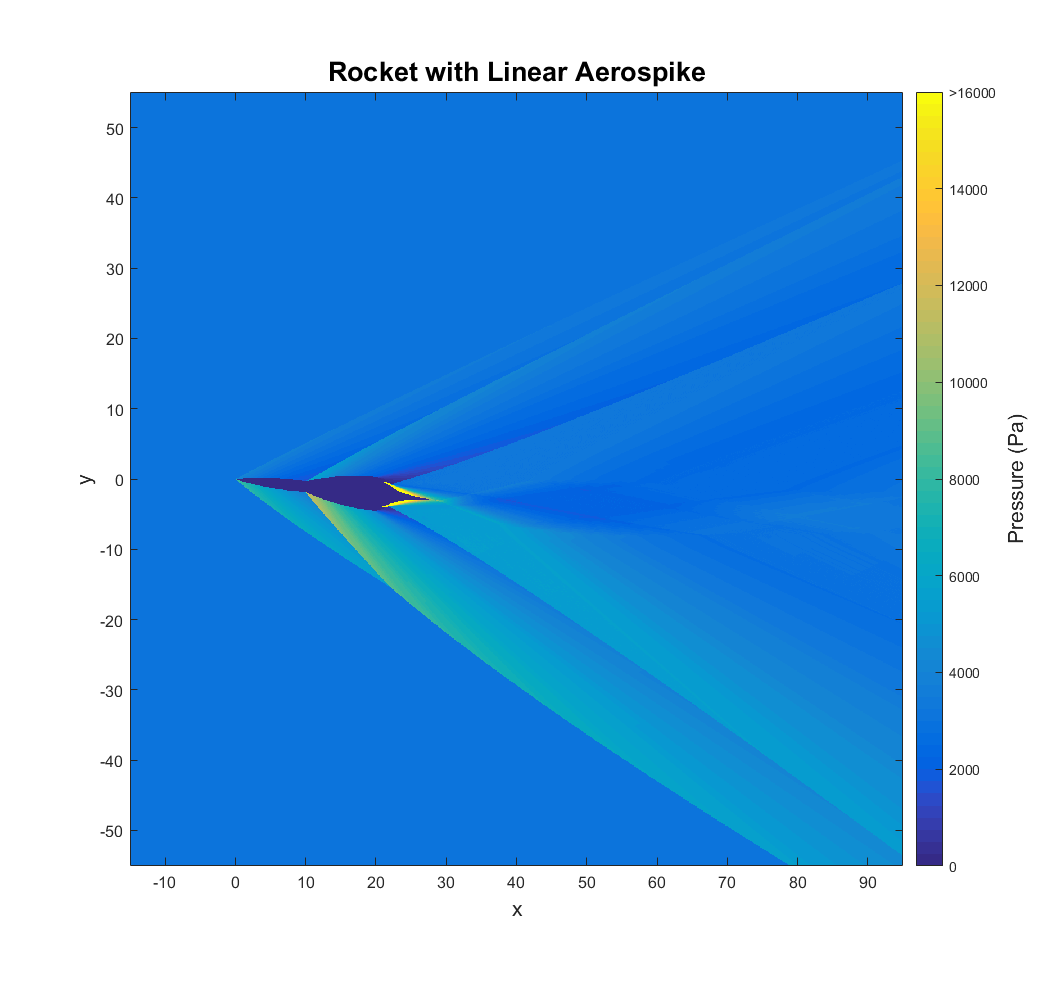 This particular aerospike is called a linear aerospike. The VentureStar, a space shuttle replacement, was going to use a linear aerospike before the program was canceled. They have the advantages of easier thrust vectoring and a modular design. I have chosen a linear aerospike because the exhaust flow is approximately two-dimensional, one of the assumptions of this method. This also means that the “rocket” it is attached to would need to be more of a spaceplane with a relatively wide lifting body. Truncating the spike would cause a region of subsonic flow to develop, so that detail has been neglected as well. As an added challenge, the vehicle is at a six-degree angle of attack so that the flow field is asymmetric.