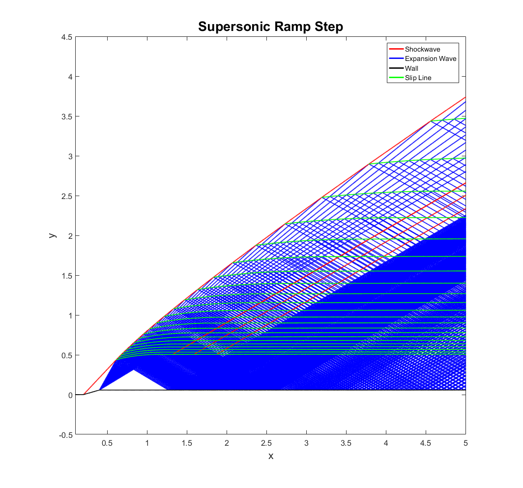 The interesting aspect of this case can be seen in the wave plot. It is clear that while most of the expansion waves are absorbed by the shockwave, there is a part of each of them that is reflected. Consider what would happen if there was no reflection. A shockwave and an expansion wave intersect. The fluid below the intersection would pass through a shockwave and an expansion wave while the fluid above the intersection would only pass through a relatively weaker shockwave. Because shockwaves are not isentropic, the stagnation pressure drop below the intersection would be greater than the stagnation pressure drop above the intersection, and consequently, there would generally be a discrepancy in static pressure between the top and bottom regions just after the intersection. To resolve this discrepancy, a reflected expansion wave leaves the point of intersection and the shockwave leaving the point of intersection becomes stronger than it would have been if there was no reflection. The strength of the two waves leaving the intersection are tied together by the flow angle after the intersection, which is solved numerically. This adjustment resolves the pressure discrepancy, but a discrepancy in Mach number known as a slip-line will remain.